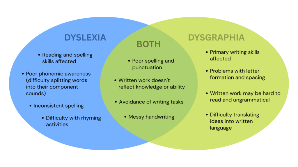 Explore this visual comparison to better understand how dyslexia and dysgraphia are similar — and how they’re not: